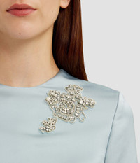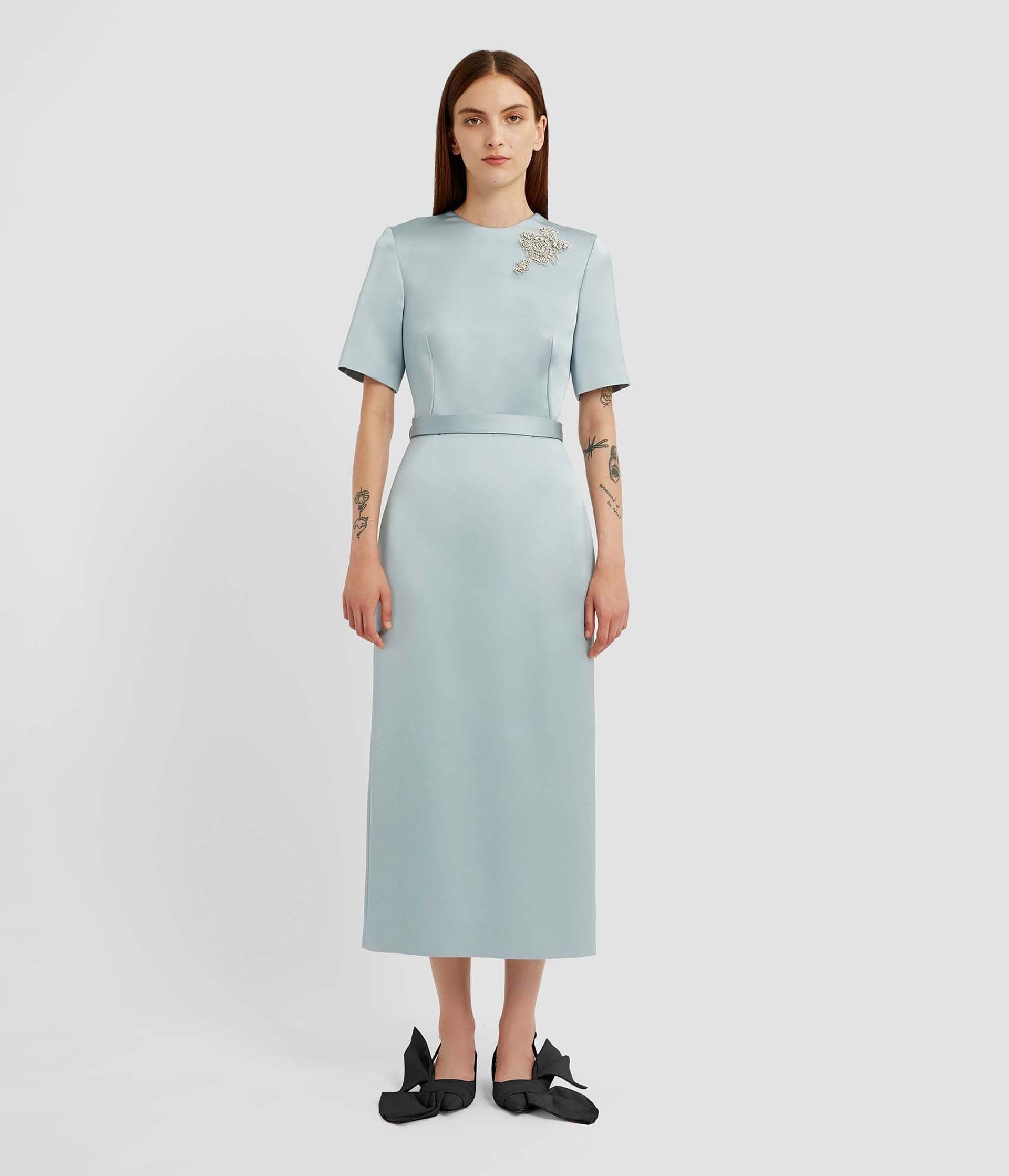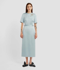 This pencil dress is crafted from cloud-blue heavy satin and is embellished with crystal embroidery. It has a tonal belt at the fitted waist. - Pencil silhouette - Fully lined - Midi length - Crew neck - Short sleeves - Centre back vent - Centre back hook, eye, and concealed zip fastenings - Product code: PF25_D27_50104005X Fits true to size.Model is 5'10" (178cm) and wears a size UK 8. Fabric and Care 70% Viscose, 30% Polyamide. Lining: 73% Acetate, 27% Silk.