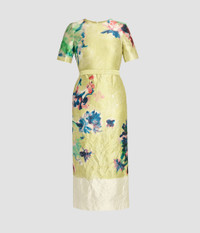 This pencil dress is crafted from crushed yellow satin and printed with multicoloured flowers. It has a tonal belt at the fitted waist. - Pencil silhouette - Fully lined - Midi length - Crew neck - Short sleeves - Centre back vent - Centre back hook, eye, and concealed zip fastenings - Product code: PF25_D27_50097001 Fits true to size with a tailored fit through the body. Fabric and Care 94% Polyester, 6% Metal. Lining: 100% Silk. Dry clean.