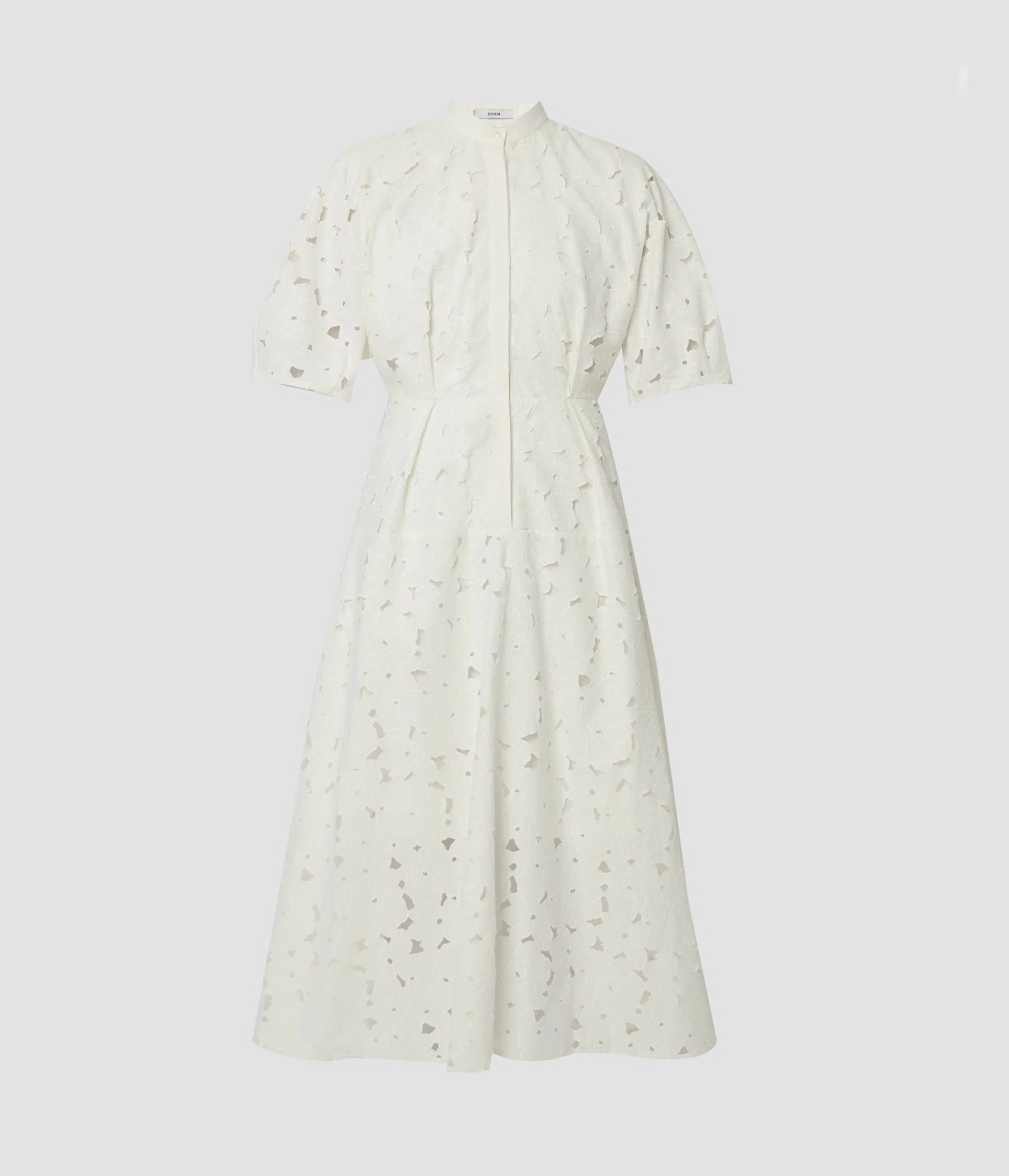 This white shirt dress is crafted from our floral cutwork cotton, a reinterpretation of a traditional decorative cloth. Shaping a feminine silhouette, it has a stand collar, puffed sleeves, and an A-line skirt. Undo a couple of buttons at the collar for a more relaxed take. Size and Fit This mid-length dress has a button-fastening stand collar, puffed sleeves, a fitted waist, and a flared skirt with hidden side seam pockets. It has concealed centre front button fastenings and is partially lined in white cotton voile. Fits true to size. Fabric and Care 55% Cotton, 45% Polyester. Lining: 100% Cotton. Dry Clean.