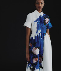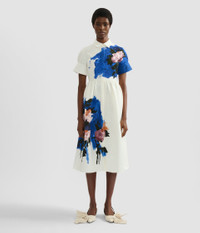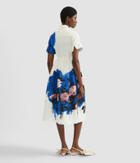 Cut from white cotton faille, this shirt dress is decorated with cobalt brushstrokes and pink roses. - Fit and flare silhouette - Unlined - Midi length - Point collar - Short sleeves with deep cuffs - Centre front concealed button fastenings - Hidden side seam pockets - Product code: PF25_D921_50064003 Fits true to size.Model is 5'11" (180cm) and wears a size UK 8. Fabric and Care Main: 66% Cotton, 34% Viscose. Secondary: 66% Cotton, 34% Viscose. Dry clean.