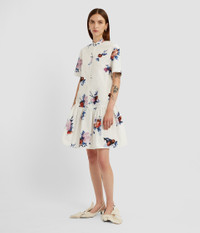 This mini dress is fitted through the body and flares to a peplum hem. It is made from white cotton poplin that is printed with bouquets of roses. - Fit and flare silhouette - Unlined - Mini length - Stand collar - Short sleeves - Flared hem - Centre front concealed button-fastening placket - Product code: PF25_D50_50019000 Fits true to size.Model is 5'10" (178cm) and wears a size UK 8. Fabric and Care Main: 100% Organic Cotton. Secondary: 100% Cotton. Dry clean.