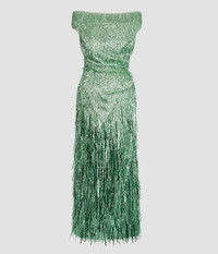This cocktail dress is covered in spearmint sequins. The slim silhouette falls to an ankle-length hem. - Slim silhouette - Fully lined - Ankle length - Off the shoulder - Cap sleeves - Centre back vent - Centre back hook, eye, and concealed zip fastenings - Product code: AW25_D152_50653009 The dress will feature a refined finish and will not include the long sequins at the base (or hemline), as originally depicted. Fits true to size. Fabric and Care 95% Polyester, 5% Spandex. Lining: 73% Acetate, 27% Silk. Dry clean.