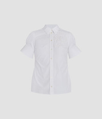 Cut from white cotton, this fitted shirt has short sleeves with flared cuffs and an embroidered flower patch at the chest. - Slim fit - Unlined - Point collar - Short sleeves with flared cuffs - Centre front button-fastening placket - Embroidered flower patch - Product code: PF25_T901_40029000 Fits true to size.Model is 5'10" (178cm) and wears a size UK 8. Fabric and Care 100% Cotton. Embroidery: 100% Cotton.