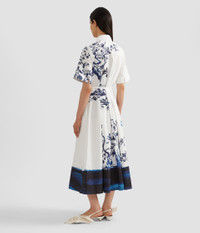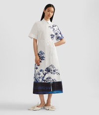 This ivory dress is cut from heavy cotton poplin which is decorated etchings of trees and a cobalt border at the hem. It shapes an A-line silhouette and has a point collar and short sleeves. - A-line silhouette - Unlined - Midi length - Point collar - Short sleeves - Centre front concealed button fastenings - Hidden side seam pockets - Product code: PF25_D61_50039000 Fits true to size with a relaxed fit through the body. Fabric and Care 100% Organic Cotton. Dry clean.