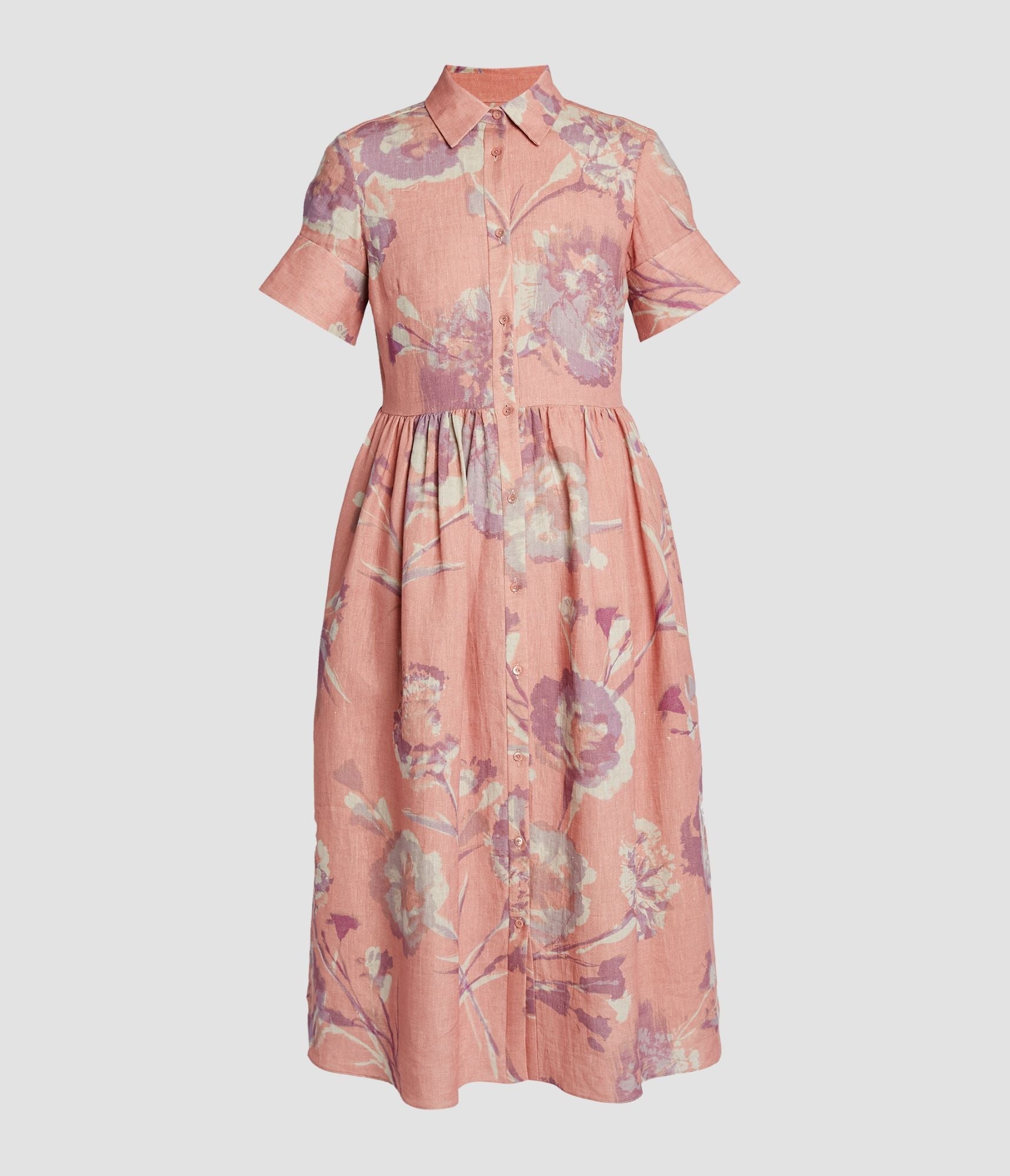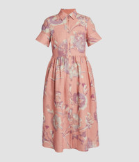 Made from linen, this rose dress showcases a carnation print originally achieved using a cyanotype process. It has flared cuffs and is gently gathered at the waist. Fit and flare silhouette Unlined Midi length Shirt collar Short sleeves with flared cuffs Centre front button-fastening placket Hidden side seam pockets Product code: SS25_D921_PICFLI Fits true to size with a loose body fit. Model is 5'11 (180cm) and wears size UK 6. Fabric and Care 100% Linen. Dry clean.