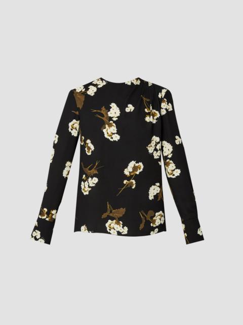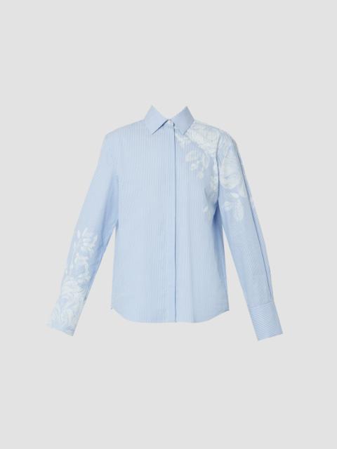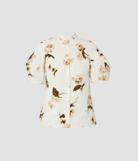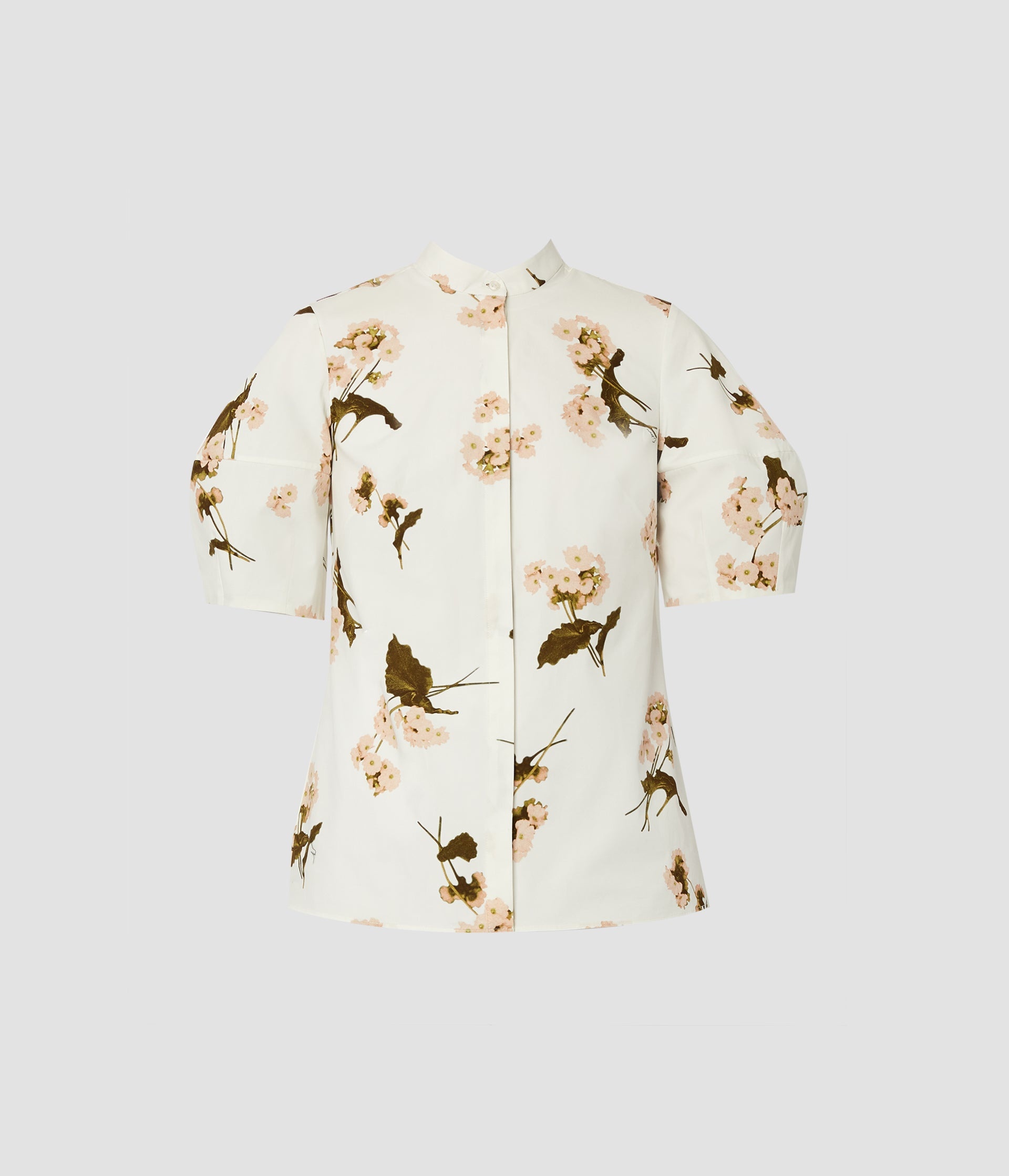 This shirt is crafted from heavy cotton poplin and shapes a structured silhouette – note the stand collar and puffed sleeves. It is printed with the Elena Garden print in pink and olive. This elegant floral harks back to designs from the 1920s and ‘30s. Size and Fit This blouse has a stand collar and voluminous short sleeves. It has a centre front concealed button stand. Fits true to size. Fabric and Care 100% Cotton. Lining: 100% Cotton. Dry Clean.