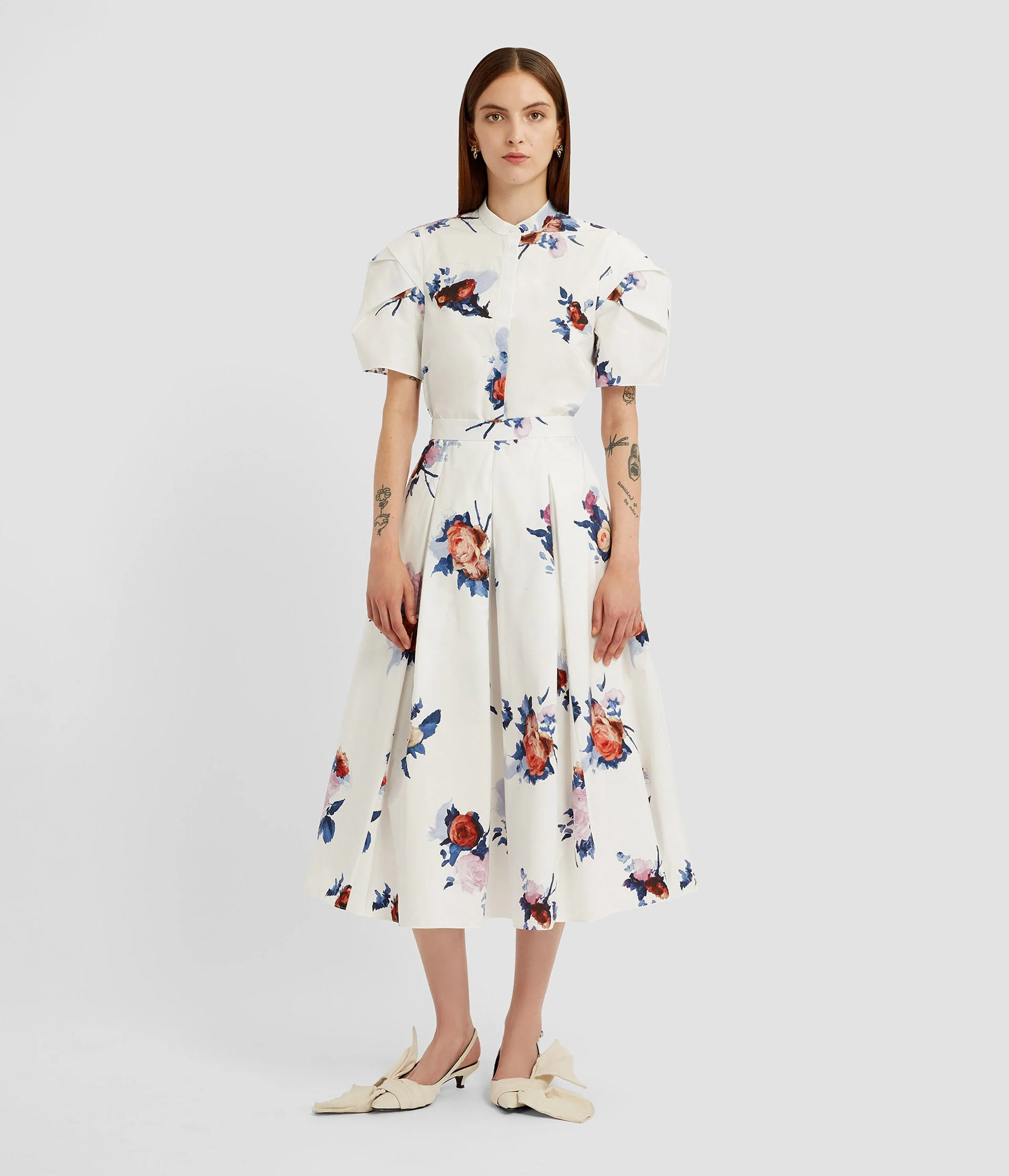 This white top is made from heavy cotton poplin that is decorated with painterly bouquets of roses. It has pleated sleeves. - Fitted silhouette - Unlined - Stand collar - Short, pleated sleeves - Concealed centre front button fastenings - Product code: PF25_T38_50019000 Fits true to size.Model is 5'10" (178cm) and wears a size UK 8. Fabric and Care 100% Organic Cotton. Lining: 100% Cotton. Dry clean.