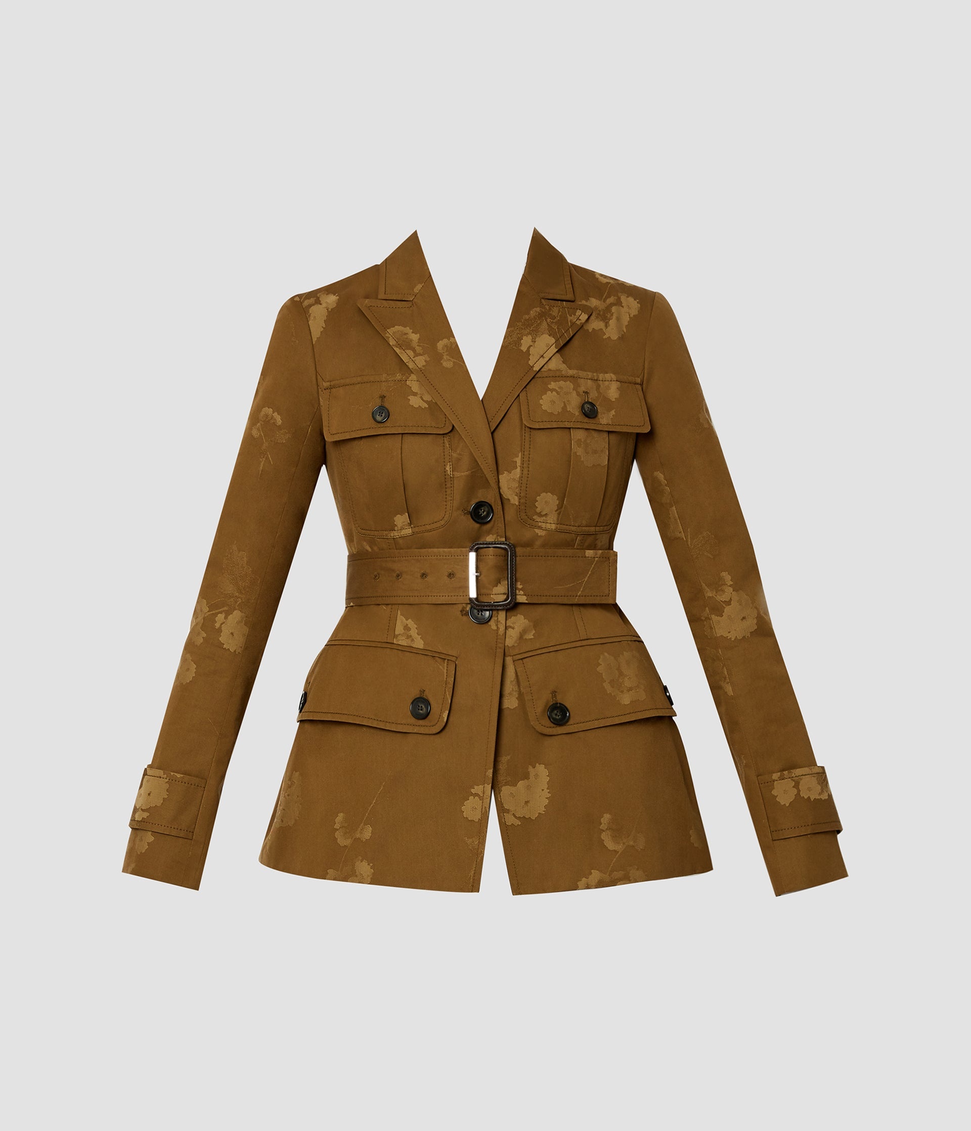 Inspired by military silhouettes, this single-breasted blazer has a lapel collar, multiple flap-front pockets, and a buckle-fastening belt. Its masculine roots are given a feminine update by way of ERDEM’s signature florals. The khaki cotton jacquard is woven with delicate blooms referencing photographs from the 1920s. Size and Fit This single-breasted blazer has a lapel collar and a buckle-fastening belt. It has button-fastening pockets at the chest and hips, as well as tabs at the cuffs. It has centre front button fastenings and fully lined in khaki cotton. Fits true to size. Fabric and Care 100% Cotton. Lining: 100% Cotton. Dry Clean.