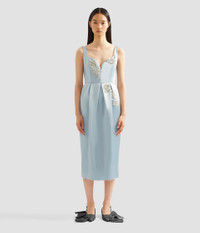 This cloud-blue heavy satin cocktail dress has an exaggerated sweetheart neckline and is embroidered with crystal appliques. - Pencil silhouette - Comes with slip dress - Midi length - Sweetheart neckline - Shoulder straps - Centre back vent - Centre back hook, eye, and concealed zip fastenings - Product code: PF25_D119_50104005 Fits true to size. Tailored fit through the body with voluminous skirt. Fabric and Care 70% Viscose, 30% Polyamide. Lining:73% Acetate, 27% Silk. Embroidery: 20% Brass, 40% Stone, 20% Metal, 20% Tulle. Dry clean.