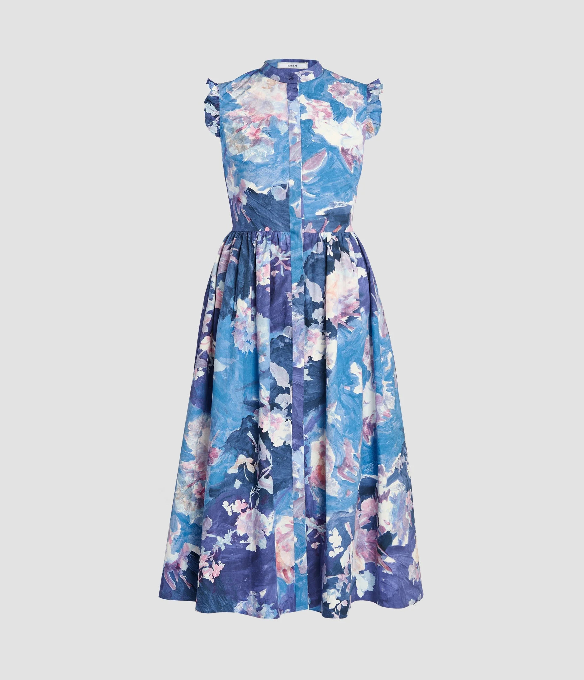 Fitted through the bodice and flaring to an A-line skirt, this mid-length dress is evocative of 1950s silhouettes. It is made from heavy cotton poplin which is decorated in a painterly cobalt floral. - Fit and flare silhouette - Unlined - Midi length - Stand collar - Ruffled shoulders - Centre front concealed button fastenings - Product code: PF25_D6_50024002 Fits true to size.Model is 5'10" (178cm) and wears a size UK 8. Fabric and Care 100% Cotton. Dry clean.
