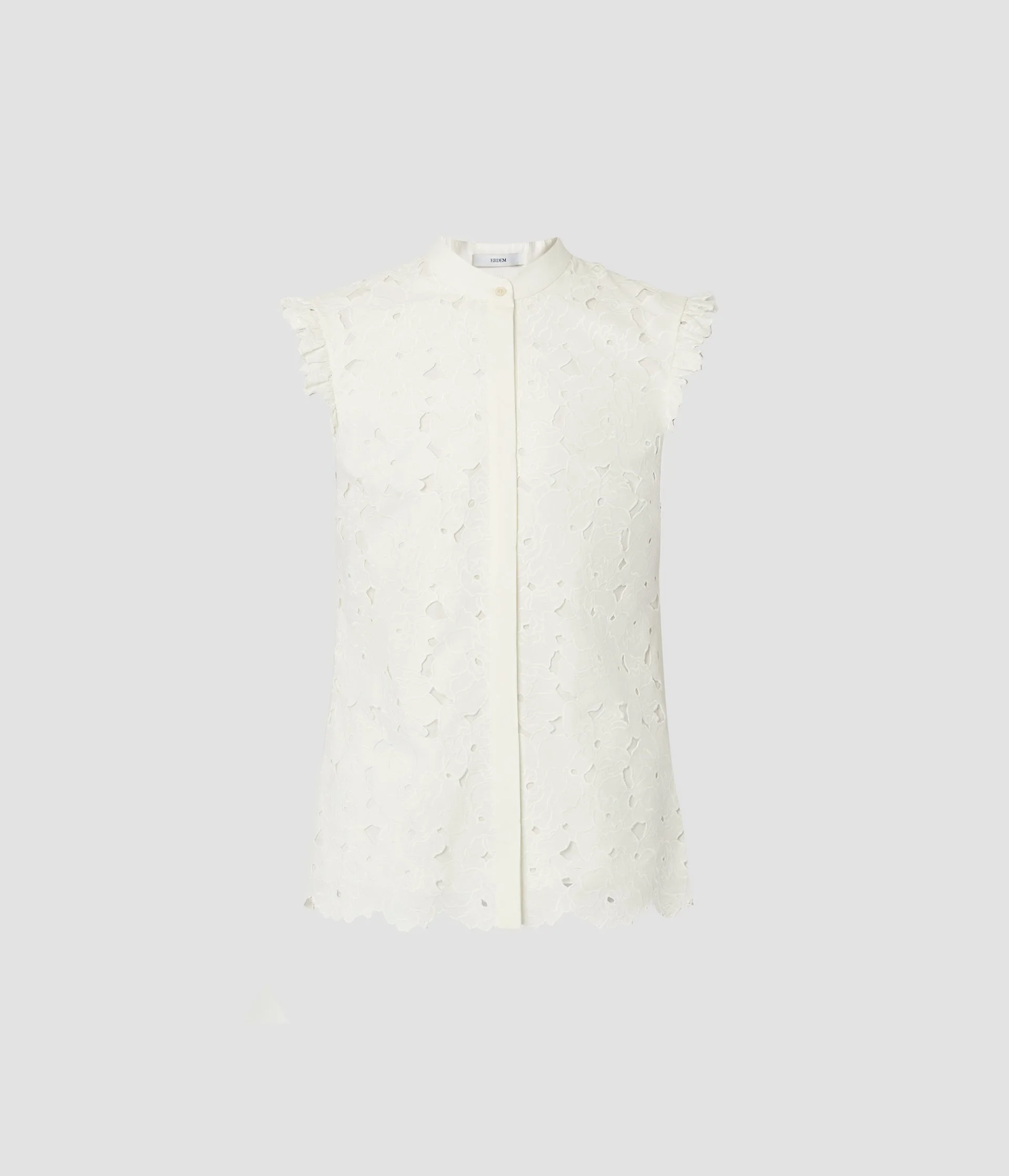 Inspired by a traditional cloth, our cotton cutwork is embroidered with a repeat flower motif. This ivory blouse will make a versatile addition to your wardrobe – easily dress it up or down. It has a flattering stand collar and ruffled trims at the shoulders. Size and Fit This blouse has a stand collar and ruffled trims at the shoulders. It has a concealed button fastening placket at the centre front. Fits true to size. Fabric and Care 55% Cotton 45% Polyester Lining:100% Cotton. Dry Clean.