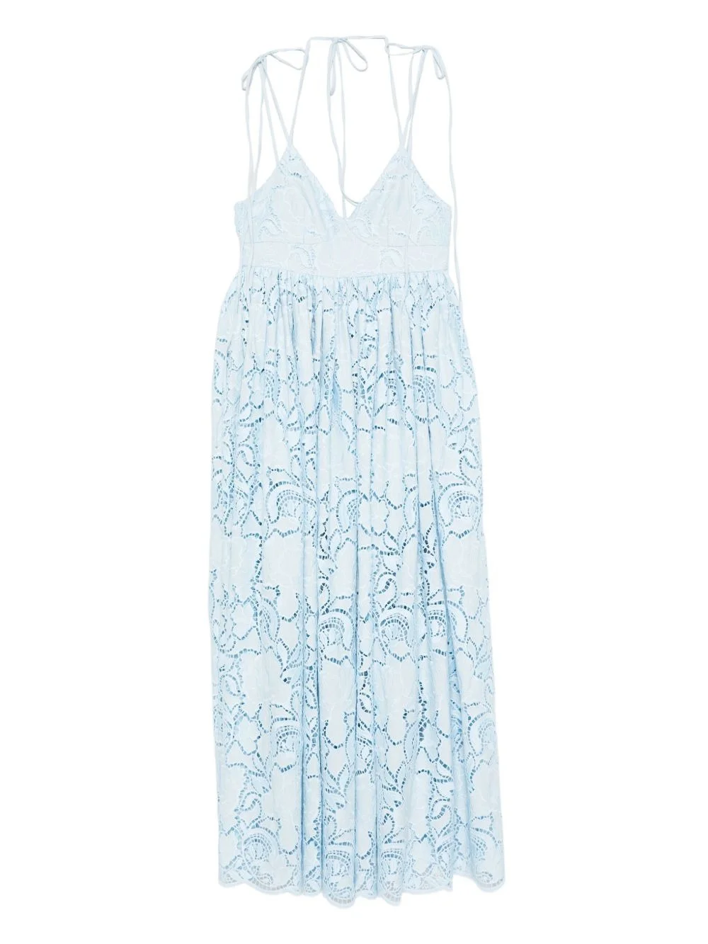 sleeveless midi dress Highlights - Light blue - Tie-fastening straps - Cut-out floral detailing Imported Composition Outer: Polyester 60%, Cotton 40% Lining: Cotton 100% SIZE & FIT Model measurements Height 5 ft 9 in(1.75 m) Bust/Chest 32.67 in(83 cm) Hips 36.22 in(92 cm) Waist 24.8 in(63 cm) Washing instructions Hand Wash