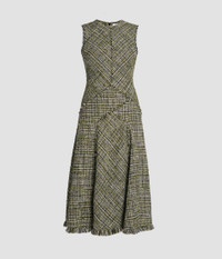 This sleeveless tweed dress is draped and falls to a fluted, mid-length skirt. It has frayed trims. - Fit and flare silhouette - Fully lined - Midi length - Crew neck - Sleeveless - Centre back zip fastening - Product code: PF25_D107_80013004 Fits true to size.Model is 5'10" (178cm) and wears a size UK 8. Fabric and Care 30% Acrylic, 20% Cotton, 17% Recycled Cotton, 11% Polyester, 7% Virgin Wool, 7% Polyamide, 4% Wool, 3% Recycled Polyester, 1% Other Fibres. Dry clean.