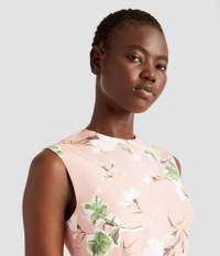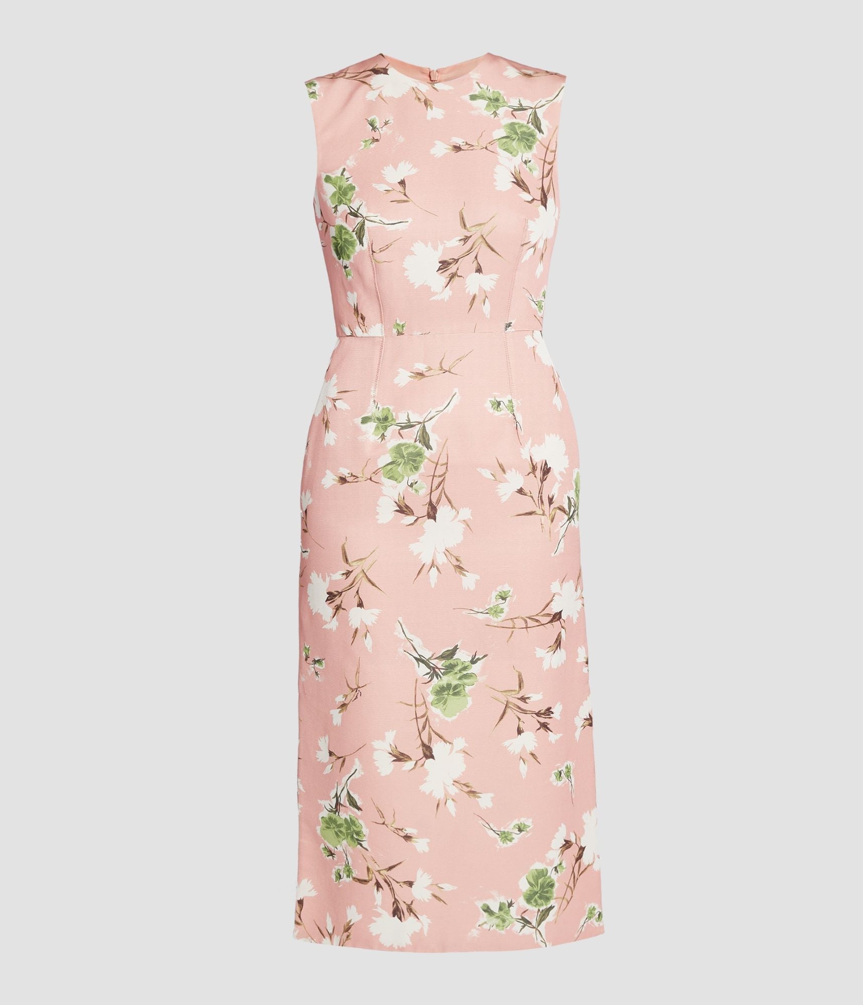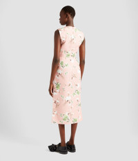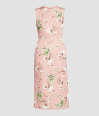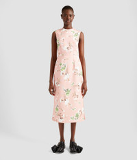 Cut from rose cotton faille, this pencil dress cuts a structured silhouette. It is printed all over with carnations, pansies, and violets. Pencil silhouette Fully lined Midi length Crew neck Sleeveless Centre back hook, eye, and concealed zip fastenings Side vents Product code: SS25_D29_PIMCF Fits true to size. Fabric and Care 66% Cotton, 34% Viscose. Lining: 100% Silk. Dry clean.