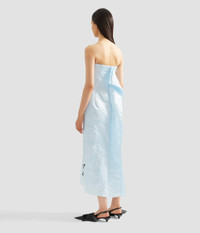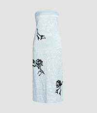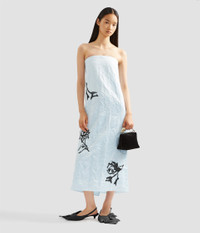 This strapless pencil dress is made from blue duchesse satin and decorated with beaded flowers based on drawings by artist Kay Donnachie. - Pencil silhouette - Fully lined - Midi length - Bandeau neckline - Strapless - Centre back split - Centre back hook, eye, and concealed zip fastenings - Product code: PF25_D102_50324005 Fits true to size. Fabric and Care Main: 100% Polyester. Secondary: 77% Polyamide, 23% Elastane. Lining: 73% Acetate, 27% Silk. Embroidery: 50% Glass, 30% Resin, 10% Polyesterastic, 10% Polyester. Dry clean.