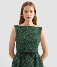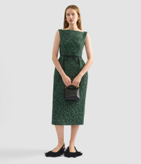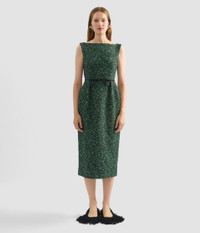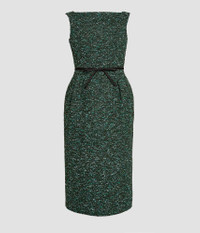 Made from hedgerow green tweed, this pencil dress is accented with a black bow at the waist. - Pencil silhouette - Fully lined - Midi length - Boat neck - Sleeveless - Centre back vent - Centre back hook, eye, and concealed zip fastenings - Product code: AW25_D32_70063007 Fits true to size. Fabric and Care 47% Virgin Wool, 16% Acrylic, 15% Polyester. Lining: 73% Acetate, 27% Silk.