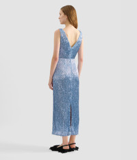 Cut for a slim, V-neck silhouette, this mid-length dress is covered in blue sequins and bugle beads. - Slim silhouette - Fully lined - Midi length - V-neck - Sleeveless - Centre back vent - Centre back hook, eye, and concealed zip fastenings - Product code: AW25_D40_50654013 Fits true to size. Model is 5'11½ (181cm) and wears a size UK 8. Fabric and Care 95% Polyester, 5% Spandex. Secondary: 100% Silk. Lining: 100% Silk. Dry clean.