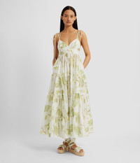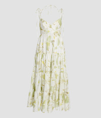 With a fitted bodice and relaxed, tiered skirt, this mid-length dress is cut from lightweight cotton poplin. It has tie-fastening shoulder and halterneck straps as well as hidden side seam pockets. The fabric is printed with a lily pad design. Fit and flare silhouette Partially lined Midi length V-neck Tie fastening shoulder and halterneck straps Tiered hem Centre back hook, eye, and concealed zip fastenings Product Code: VC25_D909_WLFCP Fits true to size. Model is 5'8½ (174cm) and wears size UK 6. Fabric and Care 100% Cotton. Lining: 100% Cotton. Dry clean.