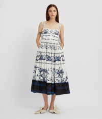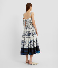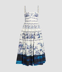 Cut from heavy cotton poplin, this white dress is decorated with an etching-inspired, blue floral which highlights the full, tiered skirt. - Fit and flare silhouette - Fully lined - Midi length - Sweetheart neckline - Shoulder straps - Tiered skirt - Centre back hook, eye, and concealed zip fastenings - Product code: PF25_D54_50039000 Fits true to size.Model is 5'10" (178cm) and wears a size UK 8. Fabric and Care 100% Organic Cotton. Lining: 100% Cotton. Dry clean.