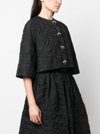 textured cropped jacket Highlights - Black - Silk - Textured finish - Crystal embellishment - Pearl detailing - Crew neck - Front button fastening - Half-length sleeves - Cropped - Straight hem Imported Composition Outer: Polyester 83%, Polyamide 17% Lining: Silk 100% SIZE & FIT Model measurements Height 5 ft 10 in(1.78 m) Bust/Chest 31.49 in(80 cm) Hips 36.22 in(92 cm) Waist 25.59 in(65 cm) FittingInformation Designed for a boxy fit, intended for a loose fit throughout Made from a midweight non-stretch fabric This piece fits true to size – take your usual size Washing instructions Dry Clean Only