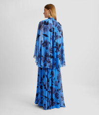 Cut from lightweight silk voile, this blue dress is decorated with oversized blooms inspired by the hand painted couture florals associated with the 1950s and ‘60s. The floor-length silhouette is defined by a necktie, waterfall sleeves, and a gathered waist. It has a beautiful sense of movement. Size and Fit This floor-length gown has a necktie, long sleeves, fitted bodice, a gathered waist, and slash side pockets. It has centre back hook, eye, and invisible zip fastenings and is fully lined in blue silk crepe de chine. Fits true to size. Model is 5'10" and wears a size UK 6. Fabric and Care 100% Silk. Lining: 100% Silk. Do Not Machine Wash / Delicate Dry Clean / Do Not Bleach / Do Not Tumble Dry / Cool Iron On Reverse.