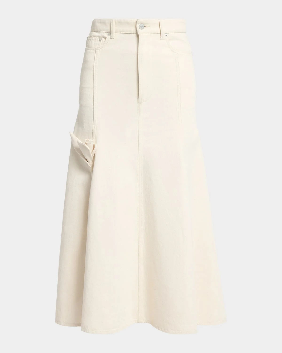 Erdem skirt is crafted from cream-washed denim finished in a fluted silhouette and accented with a tulip applique on the side High waist Five-pocket style Trumpet silhouette Hem falls below the knee Button/zip fly; belt loops Cotton Made in Portugal