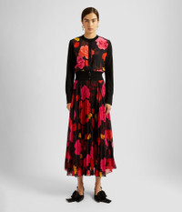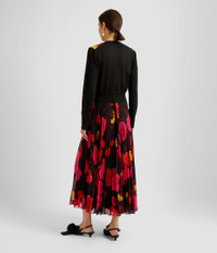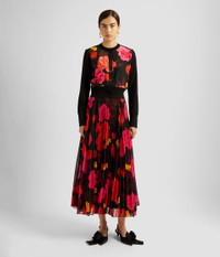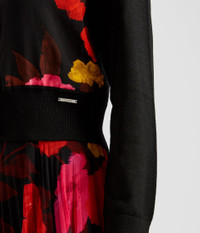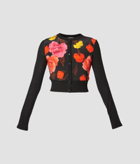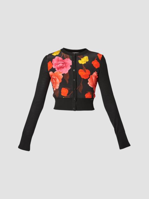 This black cardigan is knitted from lightweight merino wool and features crepe de chine panels. The floral print is inspired by hand painted designs from the 1950s and ‘60s. Shaped for a cropped fit, it has a classic crew neck. Wear it buttoned up to best showcase the flattering shape. Size and Fit This cropped cardigan has a crew neck, long sleeves, ribbed trims, and button fastenings through the centre front. Fits true to size. Model is 5'10" and wears a size UK 6. Fabric and Care 100% Wool. Fabric2: 100% Silk. Do Not Machine Wash / Delicate Dry Clean / Do Not Bleach / Do Not Tumble Dry / Cool Iron On Reverse.