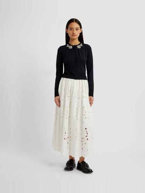 This grey jumper is knitted from pure merino wool for the softest wear. It shapes a close fit and features a draped shoulder detail beneath a decorative embellishment. Highlight the cropped hem with a high-waisted skirt. Size and Fit This slightly cropped jumper has a draped neck, long sleeves, and a ribbed hem. Fits true to size. Model is 5'10" and wears a size UK 6. Fabric and Care 100% Wool. Embroidery: 60% Glass, 20% Brass, 20% Copper. Do Not Machine Wash / Delicate Dry Clean / Do Not Bleach / Do Not Tumble Dry / Cool Iron On Reverse.