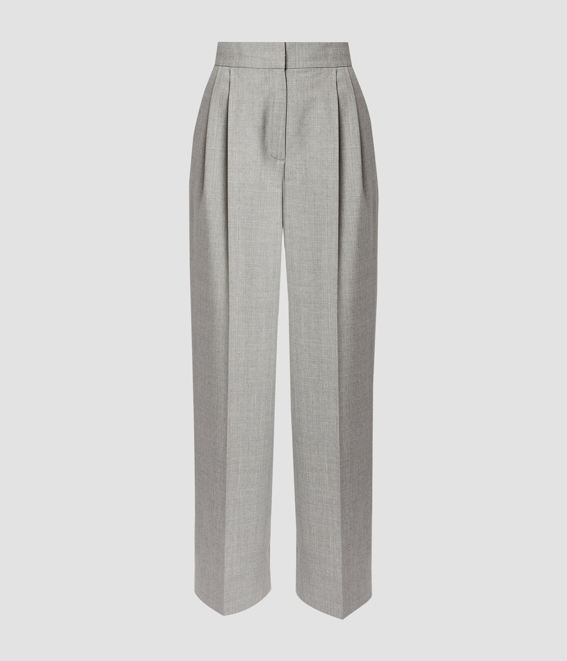 Cut from lightweight grey melange grain de poudre, these wide-leg trousers will make a versatile addition to your wardrobe. The high-rise waistband and centre front pleats are sophisticated details. Style them with the matching blazer. Size and Fit These wide-leg, ankle-length trousers have slash and jet pockets. They have a zip, hook and bar fastening at the centre front. Fits true to size. Model is 5'10" and wears a size UK 6. Fabric and Care 100% Virgin Wool. Lining: 100% Cupro. Do Not Machine Wash / Delicate Dry Clean / Do Not Bleach / Do Not Tumble Dry / Cool Iron On Reverse.