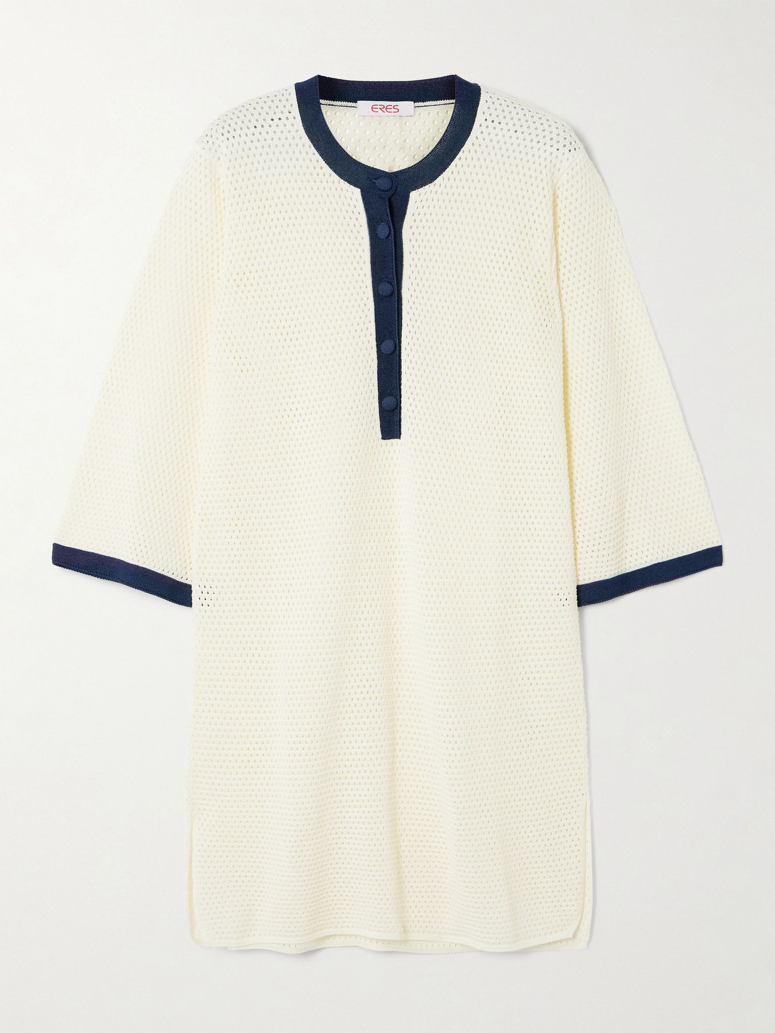 A '70s vacation mood inspires Eres' 'Albatros' dress. It's been open-knitted from cotton-blend, so it's airy and sheer - perfect for layering over a swimsuit on your way to the beach. Coordinate slides with the navy trims. Size & Fit - Fits true to size, take your normal size - Designed for a loose fit - Mid-weight, open knit - Model is 177cm/ 5'10" and is wearing a size Small Model measurements: - Bust: 77cm/ 30.5" - Waist: 62cm/ 24.5" - Hip: 88cm/ 34.5" Details & Care - Ecru and navy cotton-blend - Button fastening along front - 57% cotton, 43% viscose - Dry clean