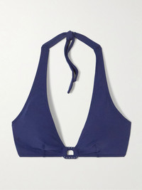 Part of the label's nautical-inspired 'Ancre' range, Eres' 'Navire' bikini top is centered with a topstitched chain link buckle. It's made from its signature peau douce fabric that smooths and supports and has high-apex cups for those who prefer more coverage. Adjust the halter neck straps as you see fit. Small to size. See Size & Fit notes. Size & Fit - Fits small to size, take one size larger than normal - Full-cup triangle style - Model is 175cm/ 5'9", bra size 32C and is wearing a FR 38 Details & Care - Navy stretch-polyamide - Ties at neck, clasp fastening at back - 77% polyamide, 22% elastane - Machine wash - Designer color: Nautique - Lotion, sunscreen, oil and chlorine can cause discoloration of this item; this is not a manufacturing defect. Please follow care instructions to keep your swimwear in the best condition