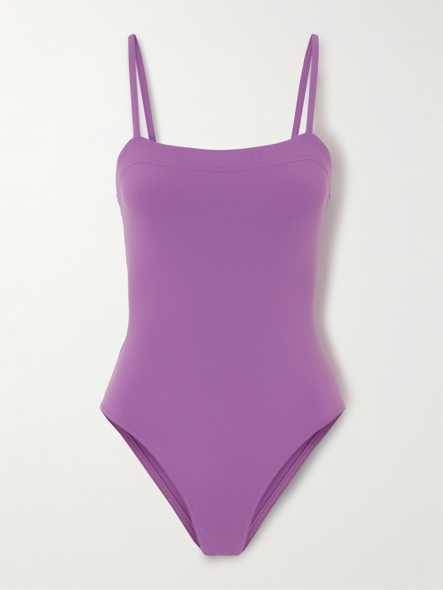 The classic design of Eres' 'Aquarelle' swimsuit ensures it'll never date. It's made from the label's smoothing peau douce fabric and has a chic squared neckline, slim straps and medium brief coverage. Small to size. See Size & Fit notes. Size & Fit - Fits small to size, take one size larger than normal - Medium brief coverage - Model is 175cm/ 5'9", and is wearing a FR 38 Details & Care - Purple stretch-polyamide - Pulls on - 77% polyamide, 23% elastane - Machine wash - Lotion, sunscreen, oil and chlorine can cause discoloration of this item; this is not a manufacturing defect. Please follow care instructions to keep your swimwear in the best condition