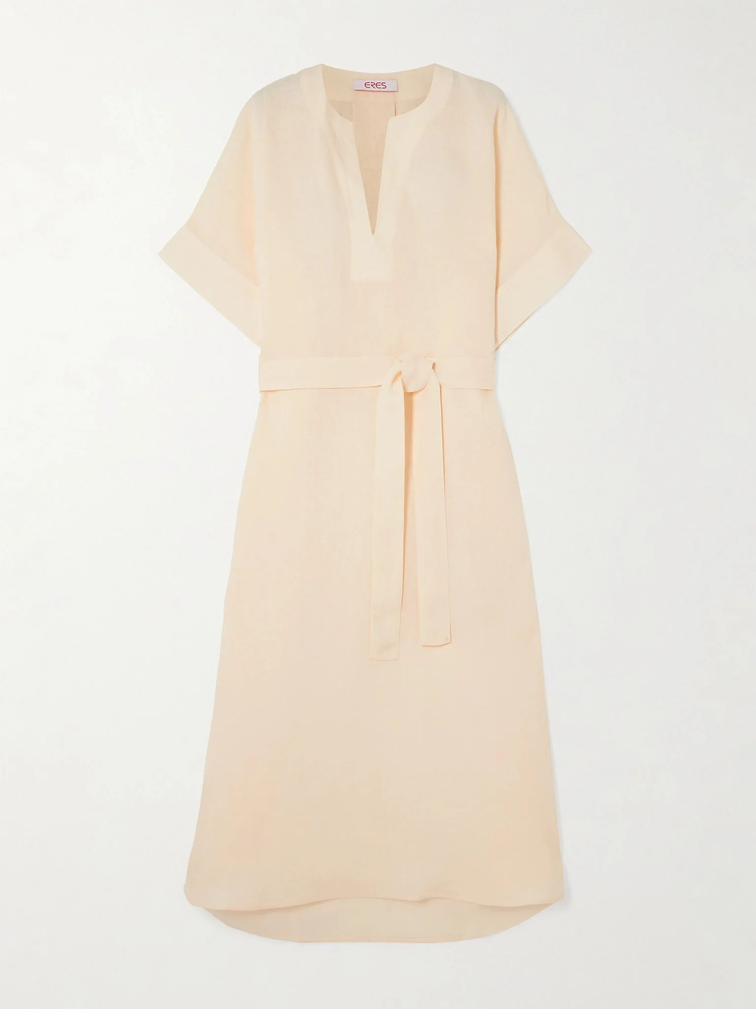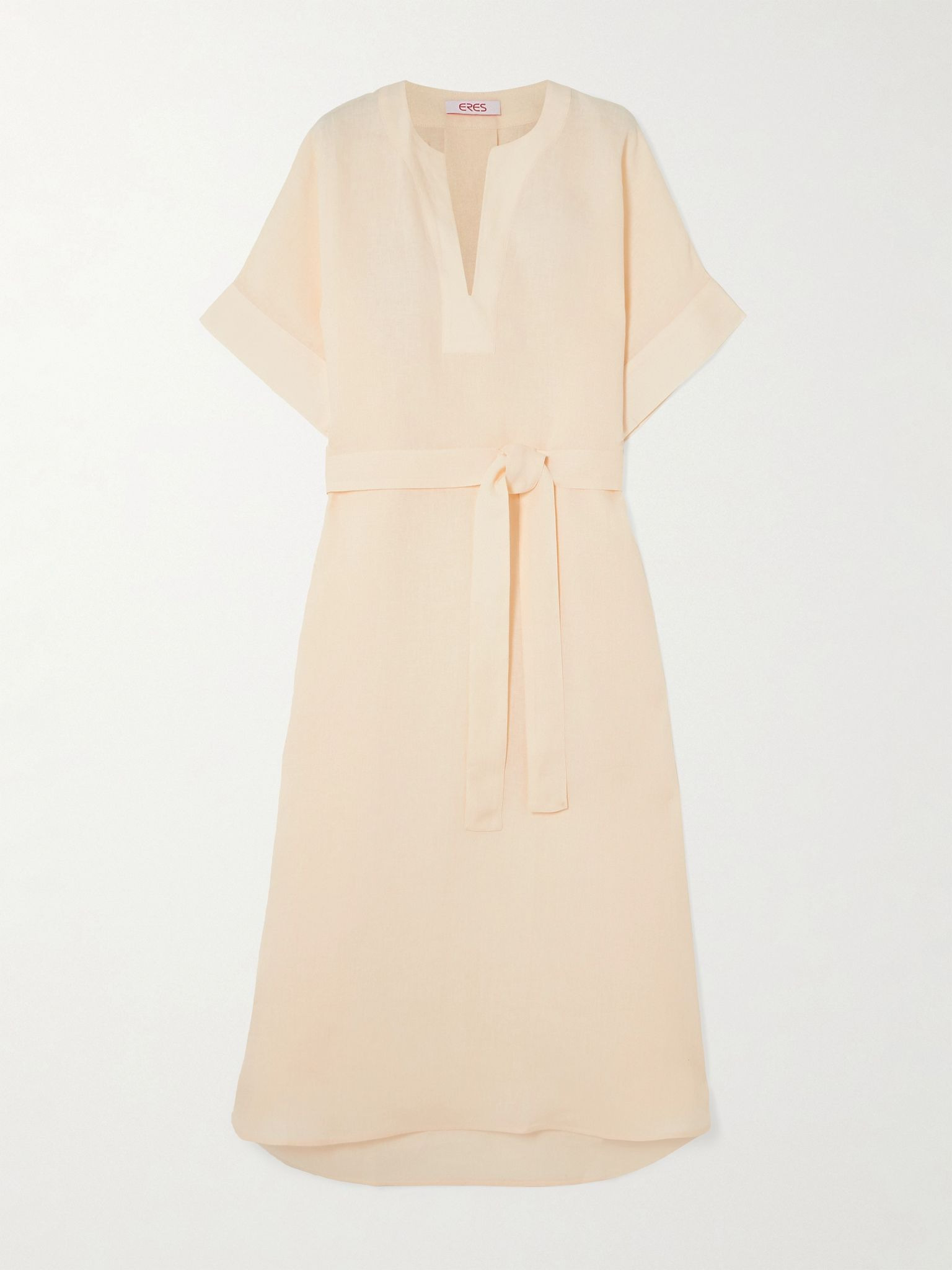 Eres' 'Bibi' kaftan is made from airy linen that's pleated through the back, so it flows beautifully. It can be cinched at the waist using the matching belt. Slip it on over your swimwear during the day and style it with lace-up sandals in the evening. Size & Fit - Fits true to size, take your normal size - Designed for a loose fit, use the tie belt to cinch in at the waist - Mid-weight, non-stretchy fabric - Model is 175cm/ 5'9" and is wearing a size Small Model measurements: - Bust: 83cm/ 32.5" - Waist: 67cm/ 26" - Hip: 89cm/ 35" Details & Care - Beige linen - Ties at front - 100% linen - Machine wash or dry clean - Designer color: Corail Blanc