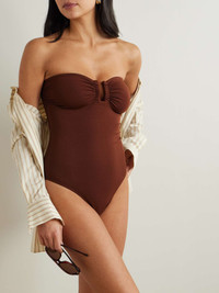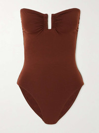 EDITORS'NOTES A timeless summer staple, Eres' sleek bandeau 'Cassiopee' swimsuit is cut from the brand's signature peau douce fabric for an ultra smooth silhouette. It's designed with a concealed U-ring for structure and a gummed internal band that keeps it securely in place. Small to size. See Size & Fit notes. SIZE & FIT - Fits small to size, take one size larger than normal - Those with a long torso may wish to take a further size up - Medium brief coverage - French sizing DETAILS & CARE - Chocolate stretch-polyamide - Pulls on - 84% polyamide, 16% spandex - Machine wash or dry clean - Designer color: Tortue - Lotion, sunscreen, oil and chlorine can cause discoloration of this item; this is not a manufacturing defect. Please follow care instructions to keep your swimwear in the best condition