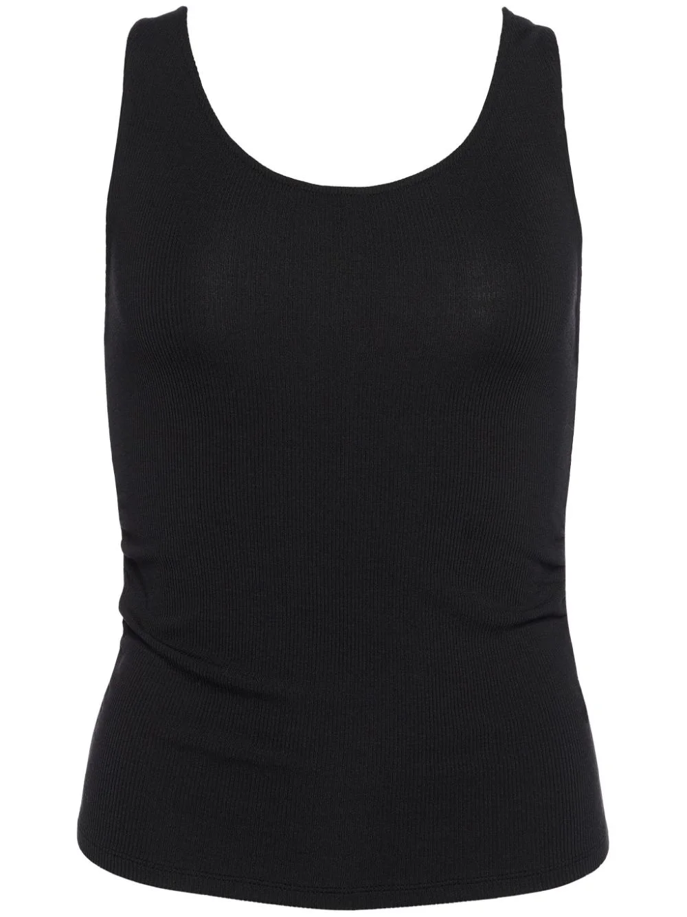 Caster tank top Highlights - Black - Silk blend - Fine ribbed - Embroidered logo to the rear - Gathered detailing - Scoop neck - Sleeveless - Racerback Made in Italy Composition Viscose 86%, Silk 11%, Fabric 3% SIZE & FIT FittingInformation This piece fits small – take one size up