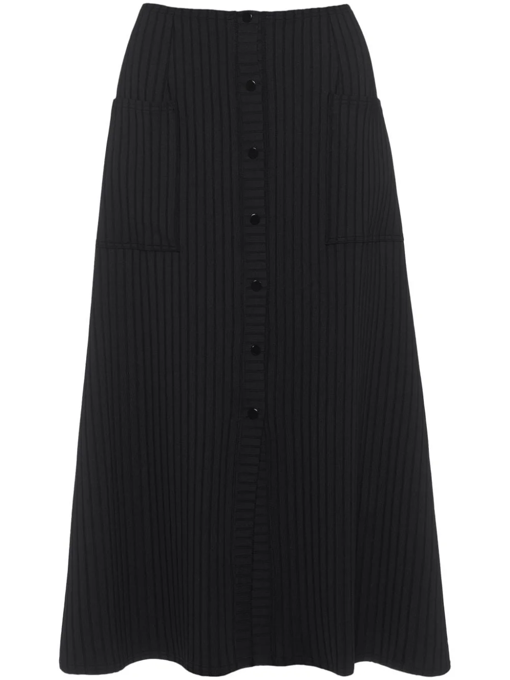 Copacabana ribbed midi skirt Highlights - Black - Ribbed knit - High-waisted - Elasticated waistband - Front press-stud fastening - Two front patch pockets - Front slit - Mid-length - Straight hem Made in France Composition Polyamide 90%, Spandex/Elastane 10%