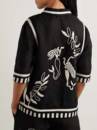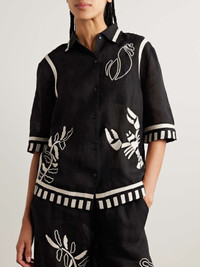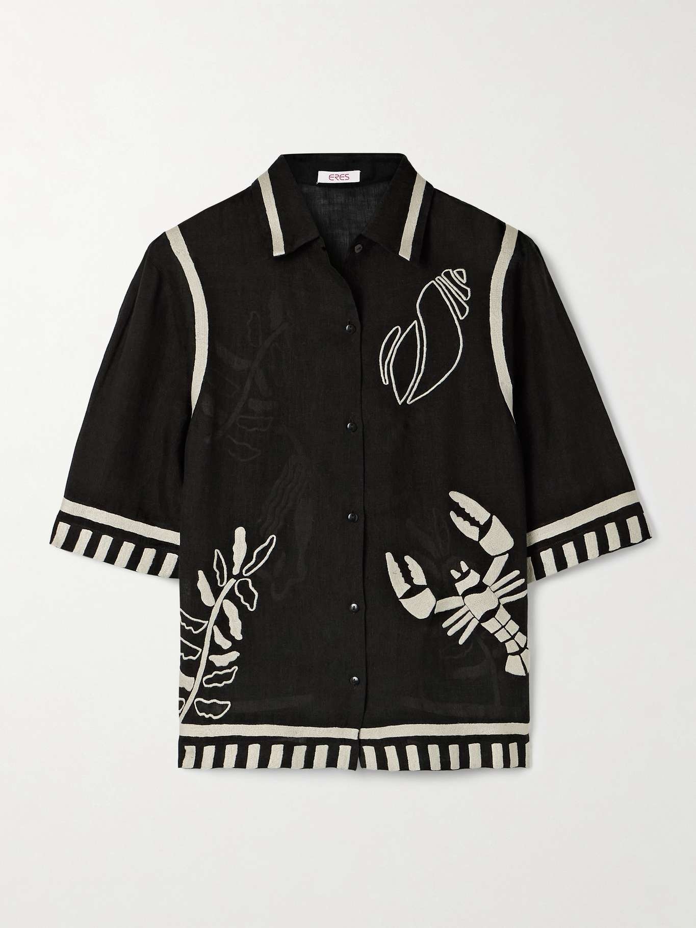 EDITORS'NOTES Perfect for summer or beach vacations, Eres' shirt is embroidered with an array of tropical motifs including a lobster, seashell and pair of mermaids. It's cut from airy black linen for a slightly loose fit and goes perfectly with the matching pants in our edit. SIZE & FIT - Fits true to size, take your normal size - Designed for a relaxed fit - Lightweight, non-stretchy fabric - Model is 177cm/ 5'10" and is wearing a size Small DETAILS & CARE - Black linen - Button fastenings through front - 100% linen - Dry clean