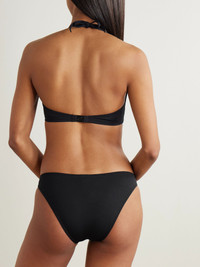Eres' signature peau douce fabric is soft, comfortable and provides light support. This classic black 'Les Essentiels Gang' bikini top has triangle cups - suitable for small to medium busts - and will never date, making it a wise investment. Small to size. See Size & Fit notes. Size & Fit - Fits small to size, take one size larger than normal - Model is 177cm/ 5'10", bra size 32A and is wearing a FR 36 Model measurements: - Bust: 79cm/ 31” - Waist: 64cm/ 25” - Hip: 91cm/ 36” Details & Care - Black stretch-polyamide - Ties at neck, clasp fastening at back - 84% polyamide, 16% elastane - Machine wash - Lotion, sunscreen, oil and chlorine can cause discoloration of this item; this is not a manufacturing defect. Please follow care instructions to keep your swimwear in the best condition