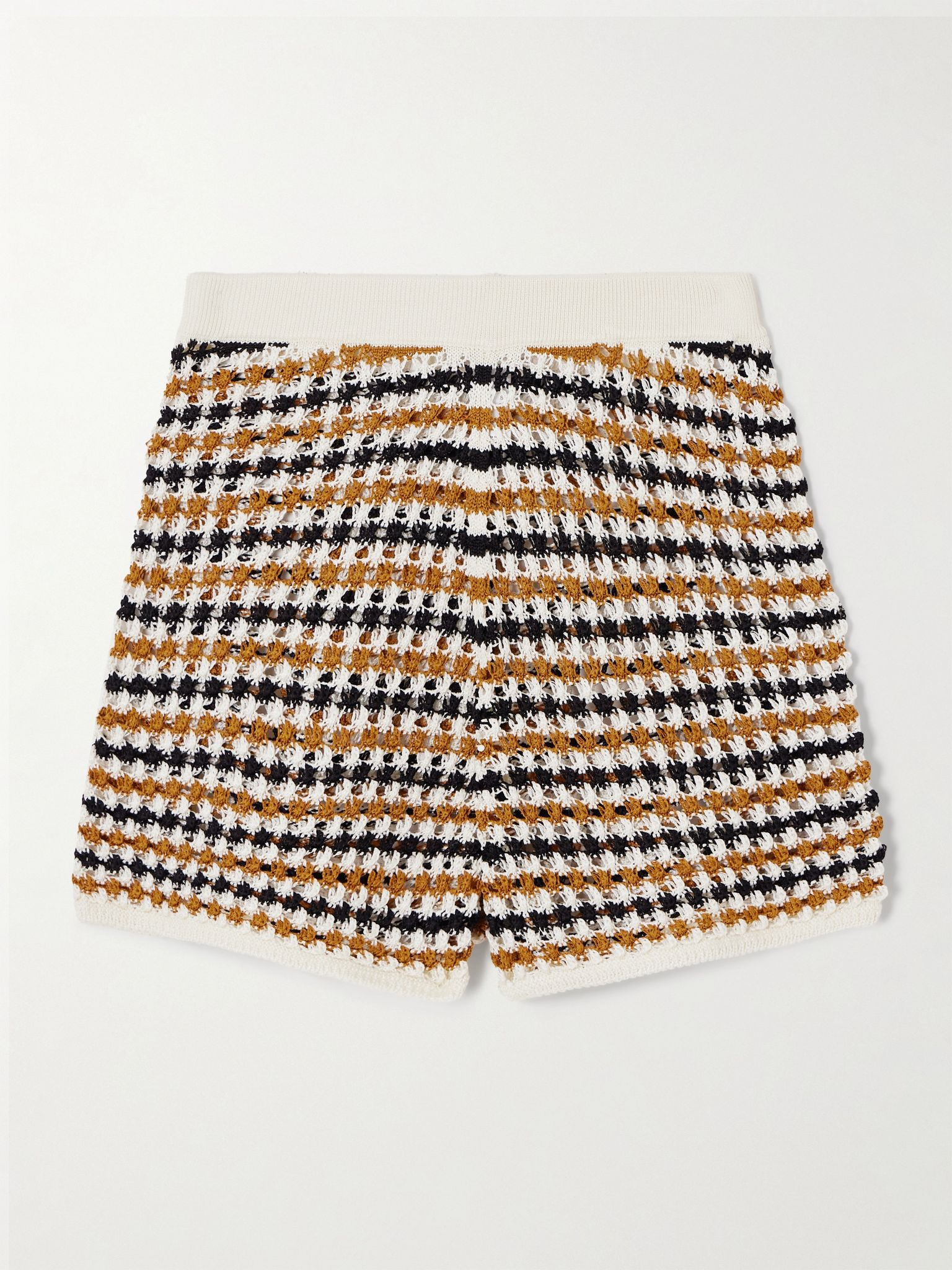 Eres' ‘Disco’ shorts channel the carefree spirit of ’70s getaway style, with a retro fit and playful energy. They're knitted from a cotton-blend with an open, airy construction and have an elasticated waistband. Wear yours as a set with the matching polo top. Size & Fit - Fits true to size, take your normal size - Mid-rise, designed for a loose fit - Mid-weight, open knit - Model is 177cm/ 5'10" and is wearing a FR 36 Model measurements: - Bust: 86cm/ 34" - Waist: 65cm/ 25.5" - Hip: 90cm/ 35.5" Details & Care - Multicolored cotton-blend - Pull on - 60% cotton, 40% viscose - Machine wash