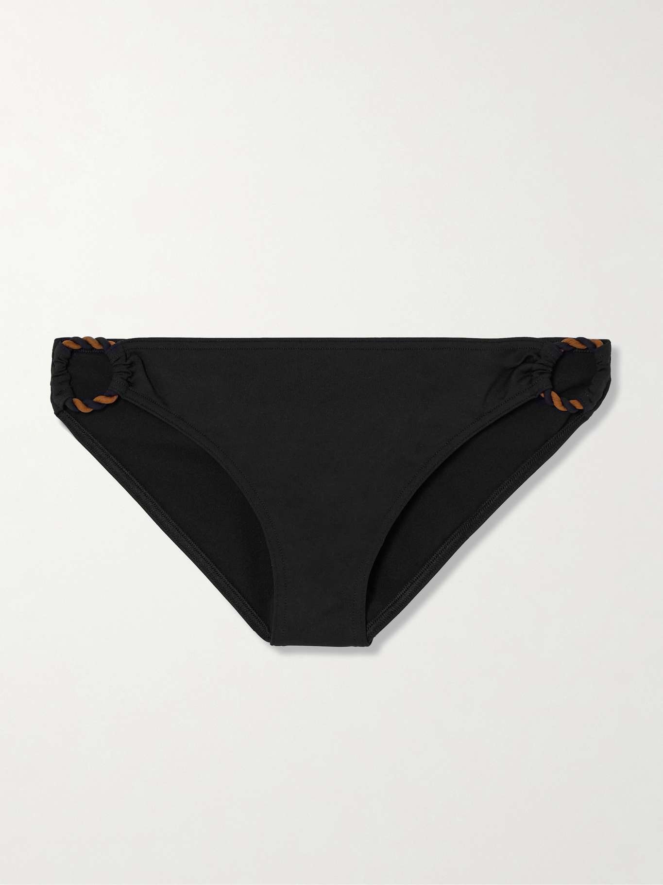 EDITORS'NOTES Eres' 'Spirale' bikini briefs are aptly named after the twisted, rope-like straps at each hip, which create a cutout effect. Made from the label's sculpting peau douce fabric, they have a mid-rise fit and offer medium coverage. Wear yours as a set with the matching 'Festif' top. SIZE & FIT - Fits small to size, take one size larger than normal - Mid-rise briefs with medium coverage - Model is 175cm/ 5'9" and is wearing a FR 38 DETAILS & CARE - Black and brown stretch-polyamide - Pull on - 84% polyamide, 16% elastane - Machine wash - Lotion, sunscreen, oil and chlorine can cause discoloration of this item; this is not a manufacturing defect. Please follow care instructions to keep your swimwear in the best condition