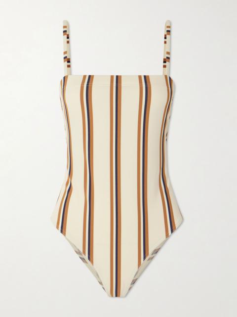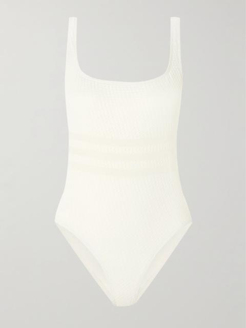 EDITORS'NOTES Eres' 'Egerie' swimsuit is part of the 'Vogue' collection - each design features tactile jacquard details inspired by a 1970s bathing cap. It's made from the label's sculpting peau douce fabric and has a retro front zip and sporty racerback straps. The underbust seam offers support. SIZE & FIT Model measurements: - Fits true to size, take your normal size - Medium brief coverage - Model is 175cm/ 5'9", bra size 32C and is wearing a size FR 36 - Bust: 85cm/ 33.5” - Waist: 63cm/ 25” - Hip: 90cm/ 35.5” DETAILS & CARE - Black stretch-polyamide - Zip fastening along front - 77% polyamide, 23% elastane - Hand wash - Lotion, sunscreen, oil and chlorine can cause discoloration of this item; this is not a manufacturing defect. Please follow care instructions to keep your swimwear in the best condition