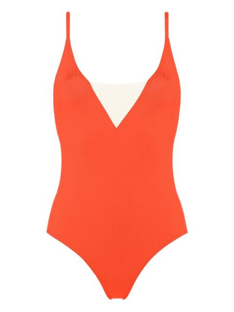 Entrevue one piece swimsuit Highlights - Blue - V-neck - Straps - V-shaped panel - Contrasting panel at the back - Be mindful to try on swimwear over your own garments. Made in France Composition Polyamide 84%, Spandex/Elastane 16% Washing instructions Machine Wash