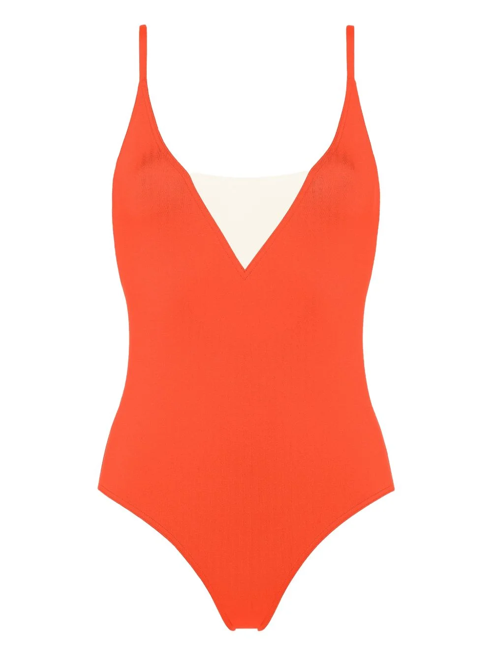 Entrevue one-piece swimsuit Highlights - Orange - Thin straps - Tank straps - Contrasting panel - Open back - Be mindful to try on swimwear over your own garments. Made in France Composition Polyamide 84%, Spandex/Elastane 16% Washing instructions Machine Wash