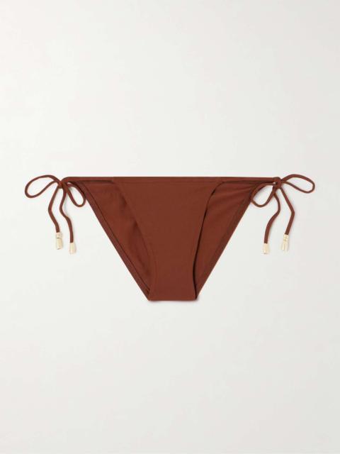 EDITORS'NOTES Eres' 'Exquise' bikini briefs have adjustable side ties tipped with hammered gold-tone beads. They've been made in Italy from the brand's smoothing peau douce fabric and can be worn high or low on the hips. Coordinate with the matching bikini. SIZE & FIT Model measurements: - Fits small to size, take one size larger than normal - Medium brief coverage - Model is 175cm/ 5'9" and is wearing a FR 38 - Bust: 85cm/ 33.5” - Waist: 63cm/ 25” - Hip: 90cm/ 35.5” DETAILS & CARE - Brown stretch-polyamide - Tie at side - 77% polyamide, 23% elastane - Hand wash - Lotion, sunscreen, oil and chlorine can cause discoloration of this item; this is not a manufacturing defect. Please follow care instructions to keep your swimwear in the best condition