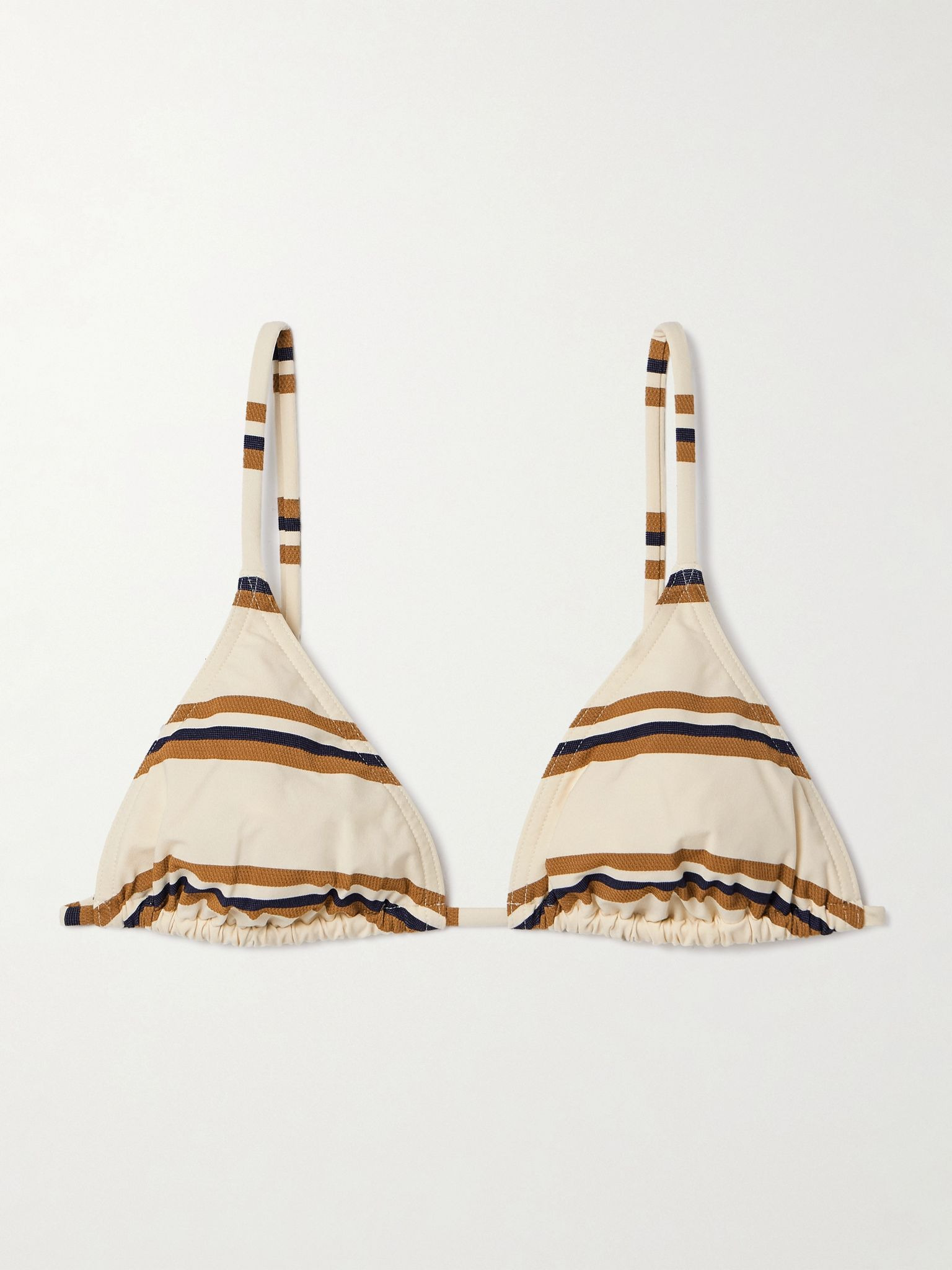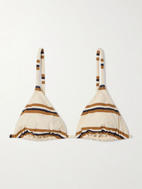 Eres' 'Mariniere Flots' bikini top is made from smoothing stretch fabric that offers gentle support and lift. Jacquard-woven with slim stripes, it has soft triangle cups and adjustable ties at the back. Wear it on vacation with the matching 'Navy' briefs. Small to size. See Size & Fit notes. Size & Fit - Fits small to size, take one size larger than normal - Those with a D cup or above may wish to take an additional size up - Model is 177cm/ 5'10", bra size 32C and is wearing a FR 38 Model measurements: - Bust: 74cm/ 29" - Waist: 61cm/ 24" - Hip: 89cm/ 35" Details & Care - Cream, tan and navy stretch-polyamide - Ties at back - 82% polyamide, 18% elastane; lining: 68% polyamide, 32% elastane - Hand wash - Lotion, sunscreen, oil and chlorine can cause discoloration of this item; this is not a manufacturing defect. Please follow care instructions to keep your swimwear in the best condition