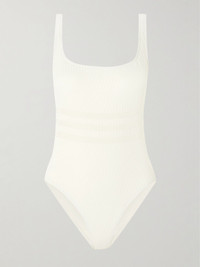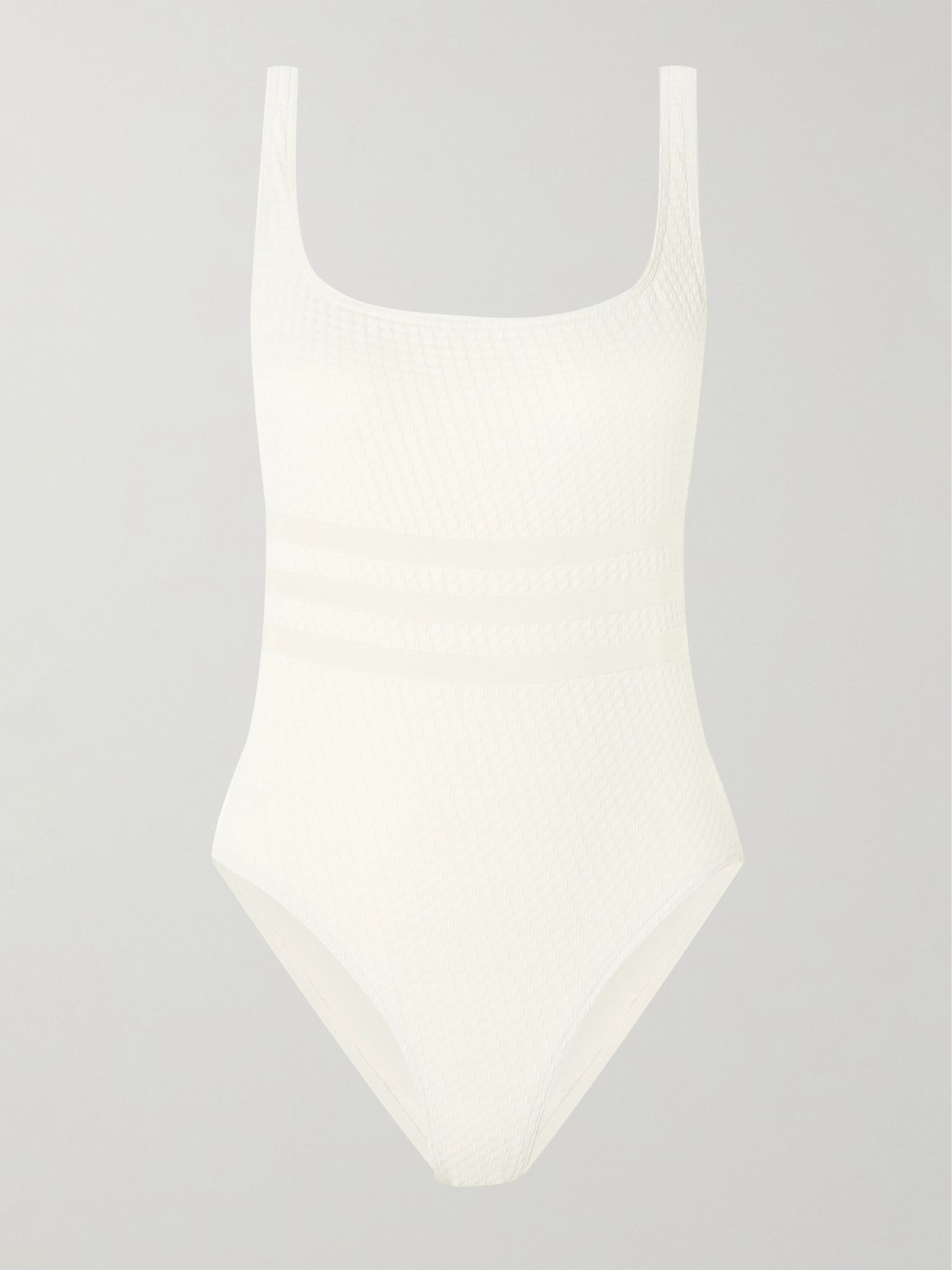 Eres' 'Glory' swimsuit from 'The Vogue' collection is traced with grosgrain stripes along the waist, drawing the eye inwards. It's made from tactile jacquard with plenty of stretch and has a classic silhouette inspired by the French label's 'Asia' style. Small to size. See Size & Fit notes. Size & Fit - Fits small to size, take one size larger than normal - Medium brief coverage - Model is 175cm/ 5'9", bra size 32D and is wearing a size FR 38 Model measurements: - Bust: 83cm/ 32.5" - Waist: 67cm/ 26" - Hip: 89cm/ 35" Details & Care - White jacquard - Pulls on - 91% polyamide, 9% elastane; lining: 68% polyamide, 32% elastane - Machine wash - Designer color: Sable Fin - Lotion, sunscreen, oil and chlorine can cause discoloration of this item; this is not a manufacturing defect. Please follow care instructions to keep your swimwear in the best condition