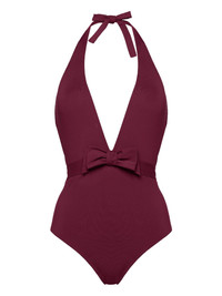 Couture halterneck swimsuit Highlights - Purple - Halter neck - Bow detail - Open back - High-leg cut - Be mindful to try on swimwear over your own garments. Made in France Composition Polyamide 77%, Spandex/Elastane 23% SIZE & FIT FittingInformation This piece fits small – take one size up Washing instructions Machine Wash