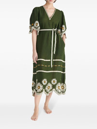 Hortense floral-embroidered linen dress Highlights - Olive green - Linen - Floral embroidery - V-neck - Short sleeves - Tied waist - A-line skirt - Mid-length - Scallop hem Imported Composition Linen/Flax 100%