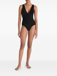 Icone button tank one-piece swimsuit Highlights - Black - V-neck - Button embellishment - Sleeveless - Scoop back - Tank straps - Be mindful to try on swimwear over your own garments. Made in France Composition Polyamide 84%, Spandex/Elastane 16% SIZE & FIT FittingInformation Designed to offer medium brief coverage This piece fits small – take one size up Washing instructions Machine Wash