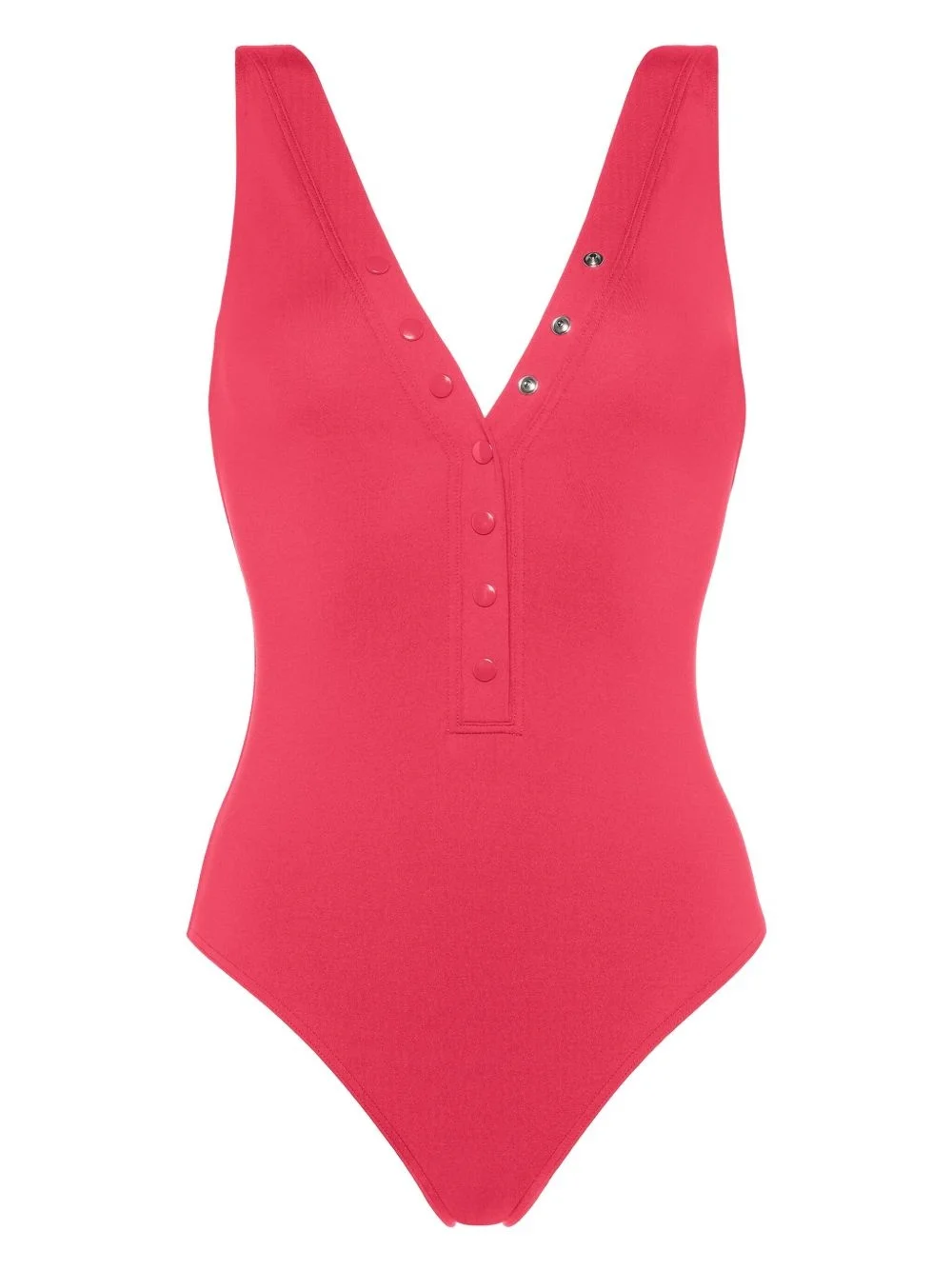 Icone swimsuit Highlights - Pink - Front press-stud fastening - Wide shoulder straps - Scoop back - Be mindful to try on swimwear over your own garments. Made in France Composition Polyamide 84%, Spandex/Elastane 16% SIZE & FIT FittingInformation Designed to offer medium brief coverage This piece fits small – take one size up